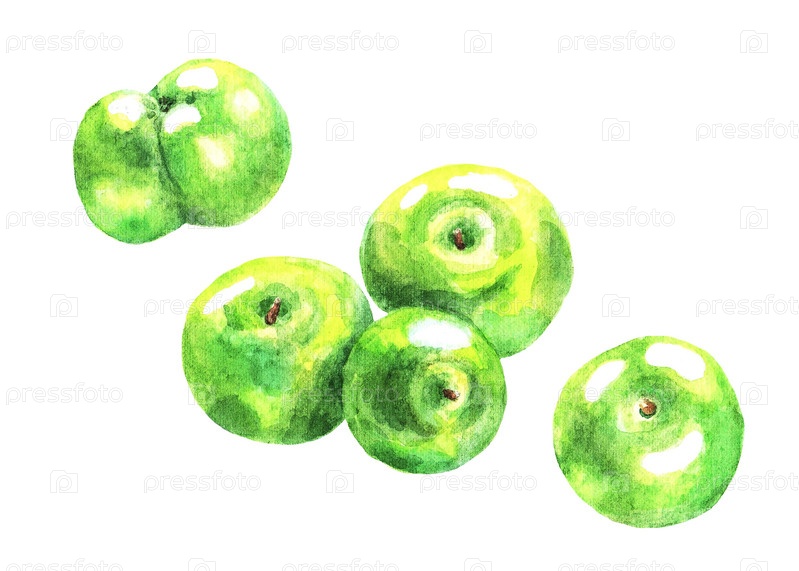 Набор зеленых яблок, акварель