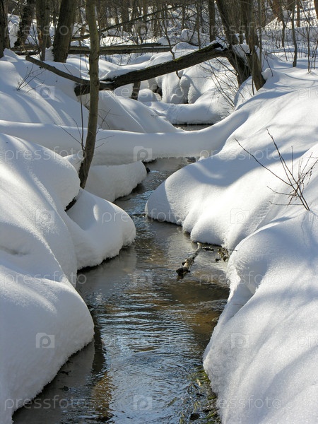Незамерзающий ручей в зимнем лесу. Солнечный день в марте