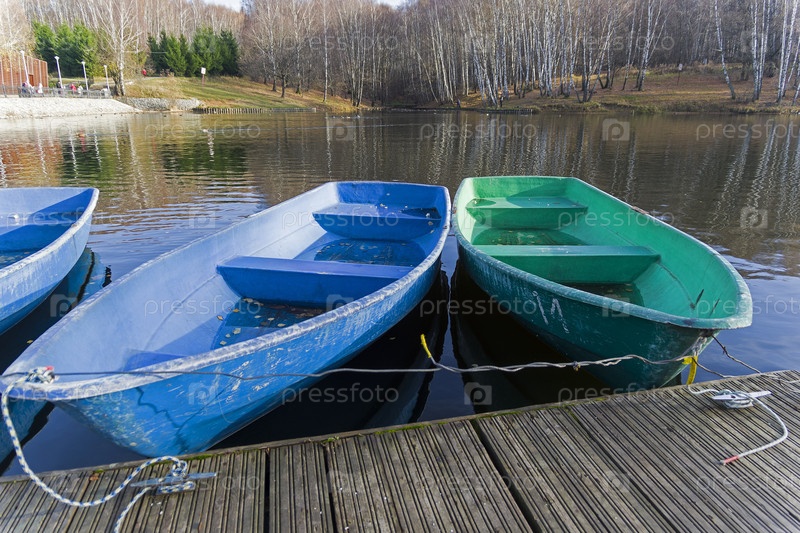 Лодки на закрытой по завершении сезона лодочной станции. Пруд в ландшафтном заказнике Теплый Стан, Москва, Россия. Начало ноября