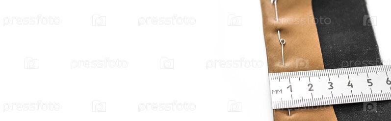 Рекламный баннер: измерение линейкой окантовочного шва при пошиве одежды. Место для текста