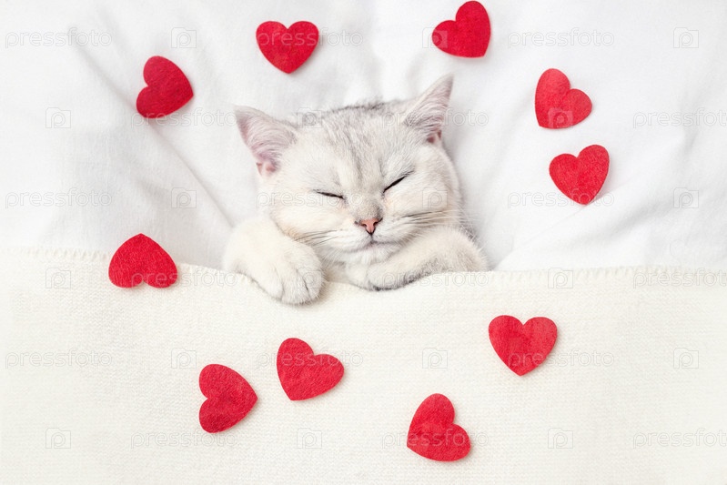 Милый белый котенок спит на белой кровати под вязаным одеялом с разбросанными красными сердечками. Вид сверху. Копировать пространство