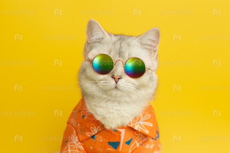 Портрет белого британского кота в солнцезащитных очках и рубашке в концептуальном лете на желтом фоне