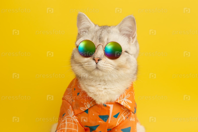 Белая британская кошка носит солнцезащитные очки и рубашку концептуально летом на желтом фоне