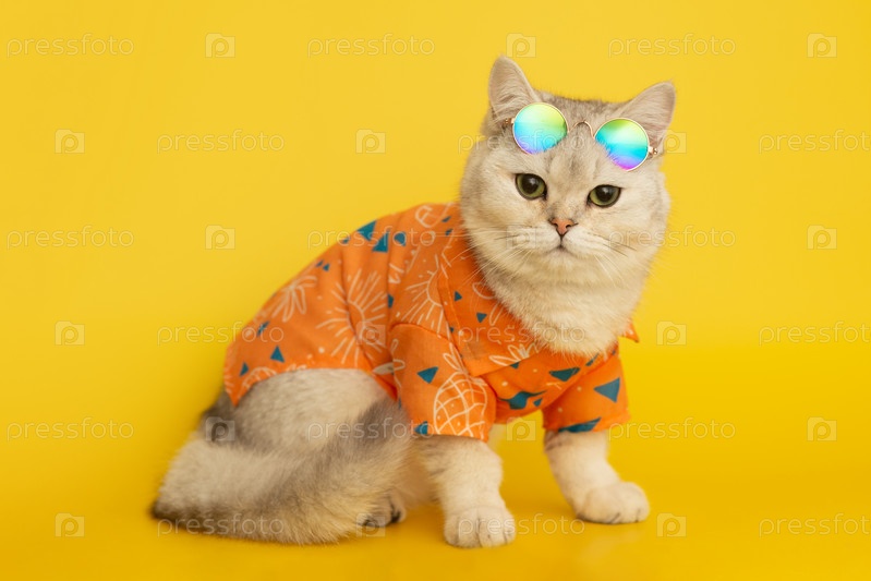 Белая кошка носит солнцезащитные очки, а рубашка сидит на желтом фоне