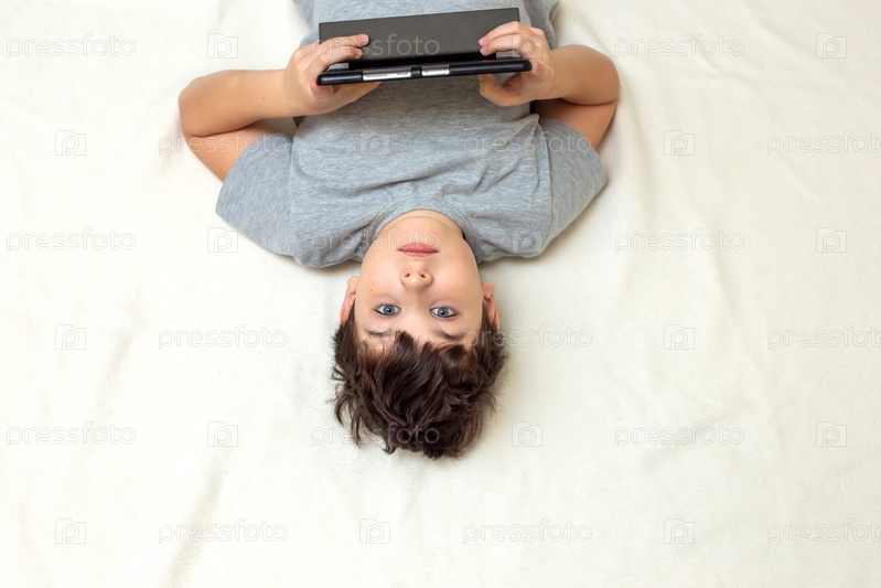 Забавный брюнет в серой футболке лежит на спине на белом одеяле в комнате и играет на цифровом планшете, смотрит в камеру. Вид сверху. Копировать пространство