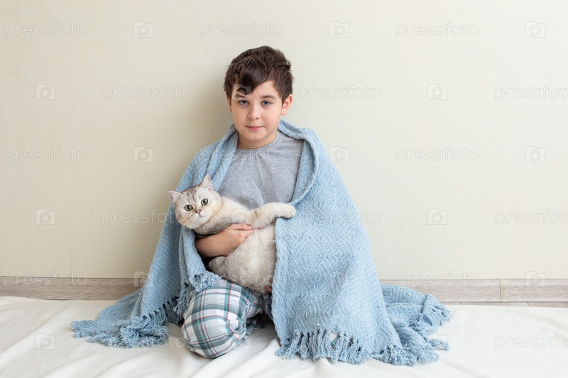 Мальчик в серой пижаме сидит на полу на вязаном голубом одеяле с красивой белой кошкой,