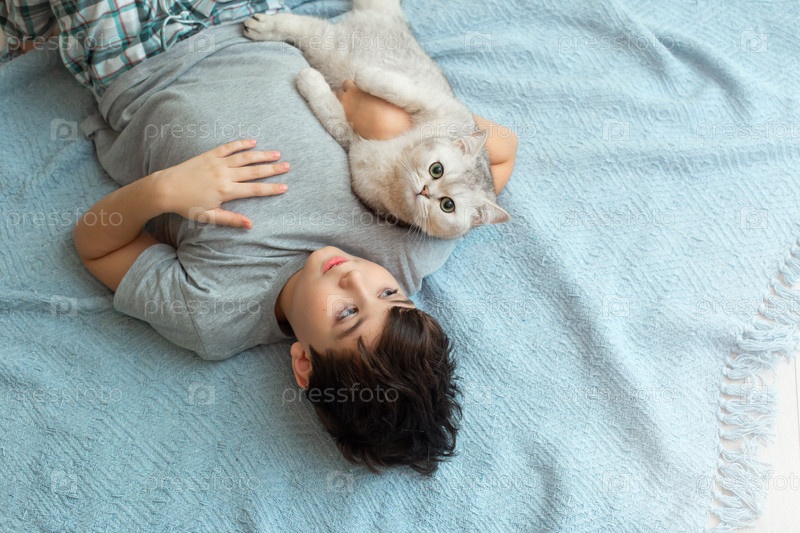 Подросток лежит на полу на вязаном синем пледе с красивой белой кошкой, днем смотрит в камеру и улыбается. Скопируйте пространство. Вид сверху