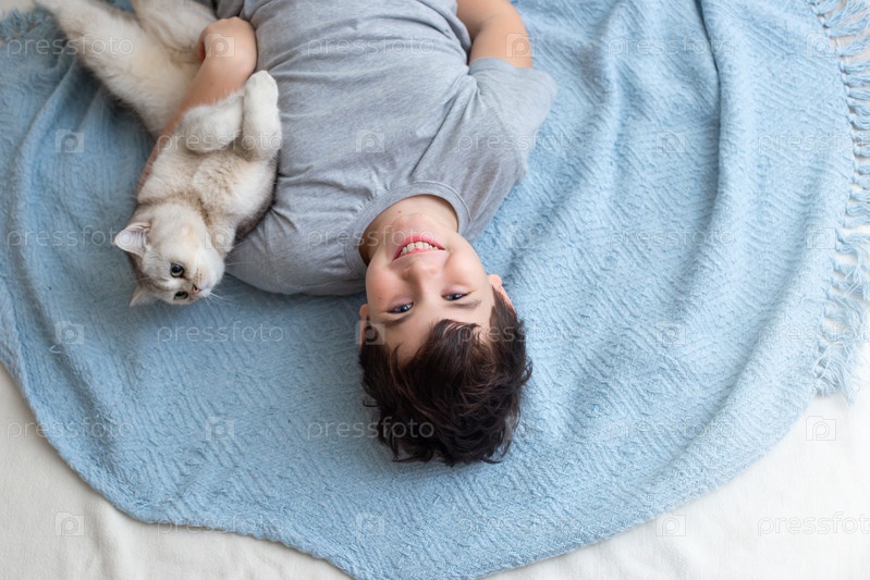 Мальчик лежит на вязаном синем пледе с красивой белой кошкой, улыбается