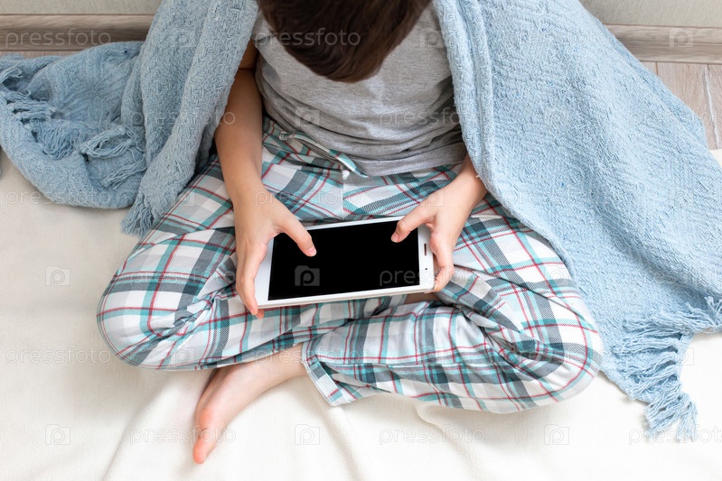 Красивый мальчик сидит у светлой стены на полу, держит цифровой планшет
