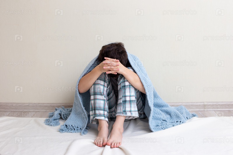 Мальчик-подросток грустный, сидит в пижаме на полу