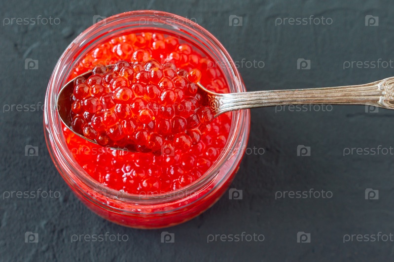 Красная икра в стеклянной банке с серебряной ложкой. Морепродукты. Здоровое питание. Диета. черный фон