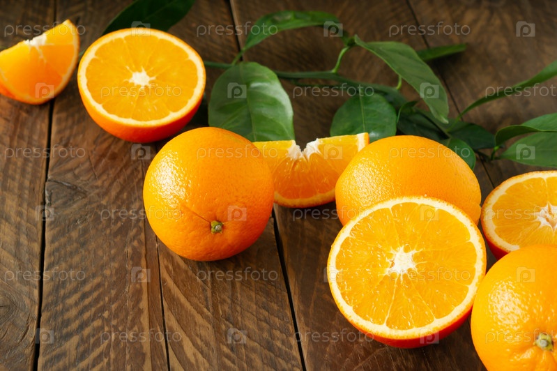 Свежие апельсины с зеленым карнизом на деревенском деревянном фоне с копией пространства