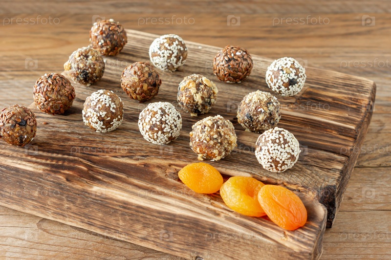 Домашние энергетические шарики с курагой, изюмом, финиками, черносливом, грецкими орехами, миндалем и кокосом на деревянном фоне. Здоровая сладкая еда