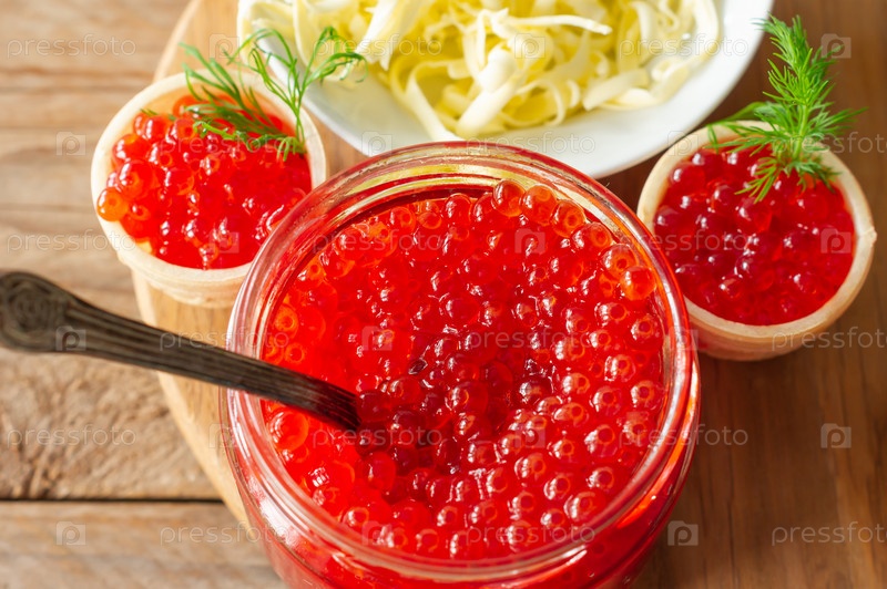 Тарталетки со сливочным маслом и красной икрой. Изысканная еда, закуски. Гастроном. Морепродукты