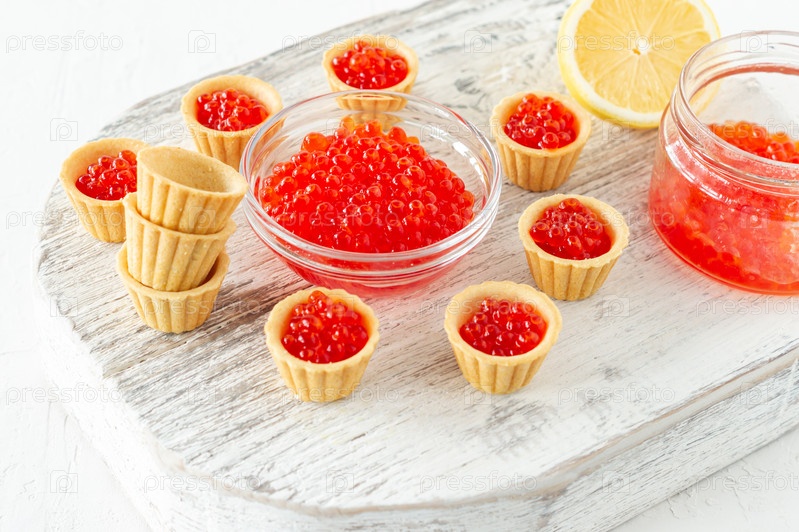 Тарталетки со сливочным маслом и красной икрой. Изысканная еда, закуски. Гастроном. Морепродукты