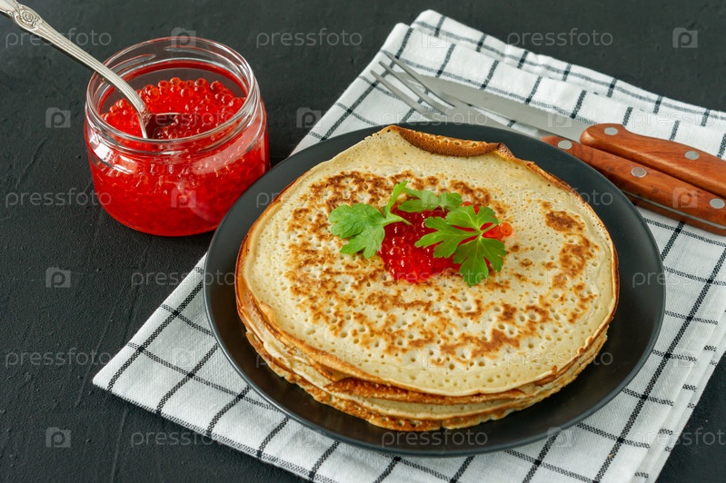 Традиционные русские крепы блины сложены в тарелку с красной икрой на деревянном фоне. Масленица традиционная русская праздничная еда. Русская еда, русская кухня. Закрыть