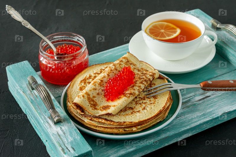 Традиционные русские крепы блины сложены в тарелку с красной икрой и горячим лимонным чаем на деревянном фоне. Масленица традиционная русская праздничная еда. Русская еда, русская кухня