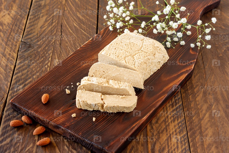 Нарезанный десерт халва из подсолнечника на деревянной доске на столе. Сладкий восточный десерт из орехов и семечек
