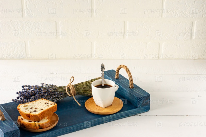 Кусочки пирога с изюмом и чашка кофе подаются на подносе. Утренний вкусный завтрак