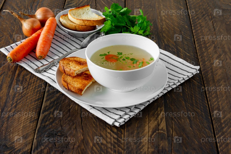 Свежий бульон в белой миске с мелко нарезанными травами с петрушкой и чесноком на деревянном столе. Горячий суп из куриного мяса, моркови, лука, чеснока, петрушки и перца