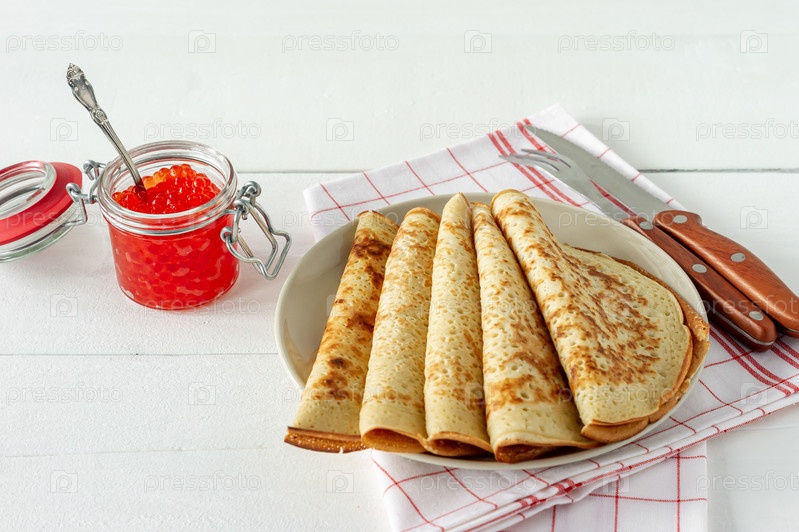 Традиционные русские блинчики на тарелке с красной икрой на светлом фоне. Масленица традиционная русская праздничная еда. Русская еда, русская кухня