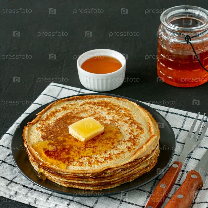 Блины подаются с медовым сиропом и маслом на темной тарелке. Традиционные блинчики на масленицу или масленицу