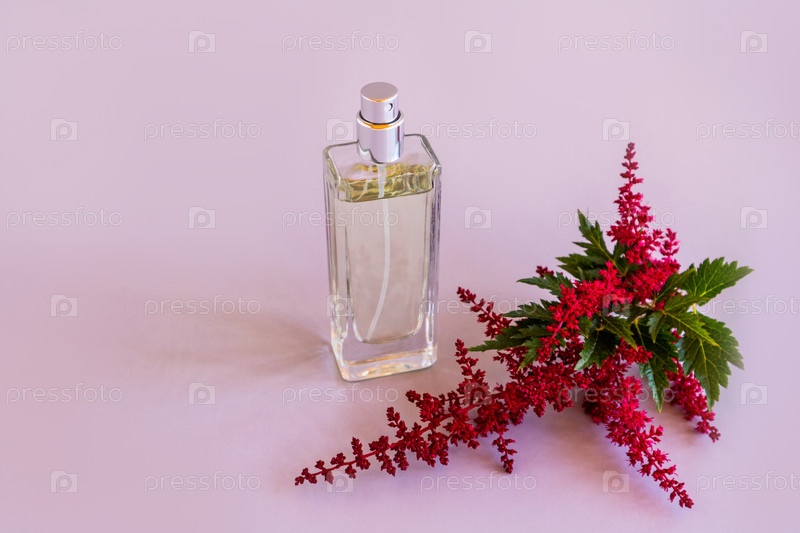 Флакон женских духов на розовом фоне с астильбой. копия пространства. понятие парфюмерии и красоты