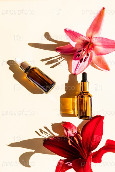 Вид сверху на две прозрачные бутылки с капельницей с натуральным косметическим продуктом для ухода за лицом и телом. жесткие тени. цветок. вертикальный вид