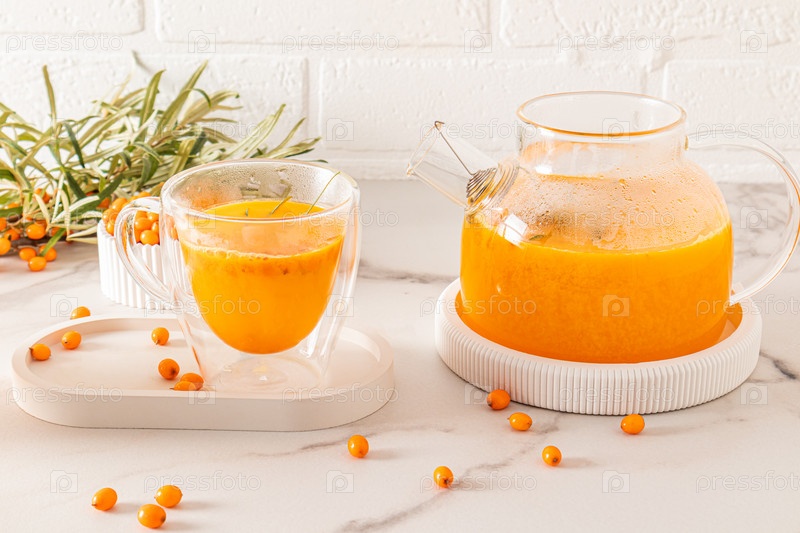 Вкусный полезный чай из облепихи в стеклянном чайнике и чашка на мраморной столешнице на фоне белой кирпичной стены. горячий осенний напиток