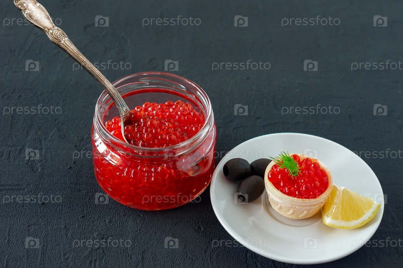 Тарталетки со сливочным маслом и красной икрой. Изысканная еда, закуски. Гастроном. Морепродукты