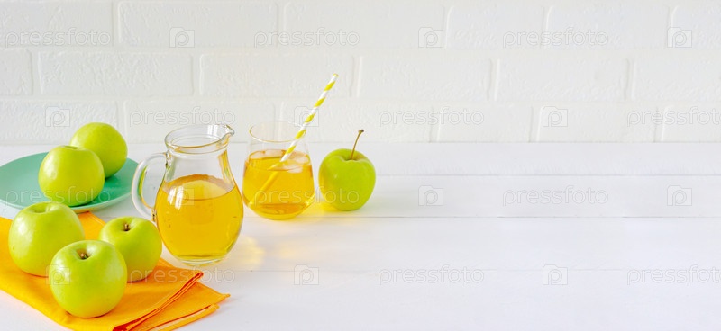 Свежий домашний яблочный сок и зеленые яблоки на белом столе. Здоровый утренний напиток