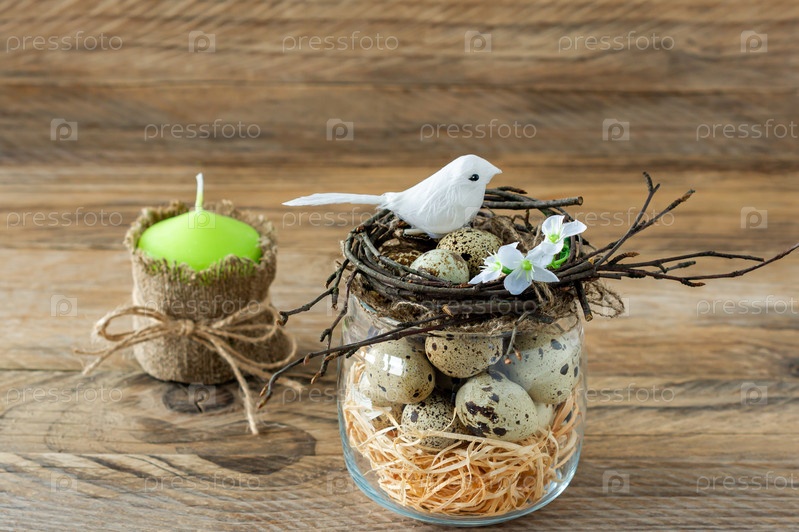 Композиция с гнездом из веток, перепелиными яйцами и мелкими птицами. Пасхальные праздники в деревенском стиле