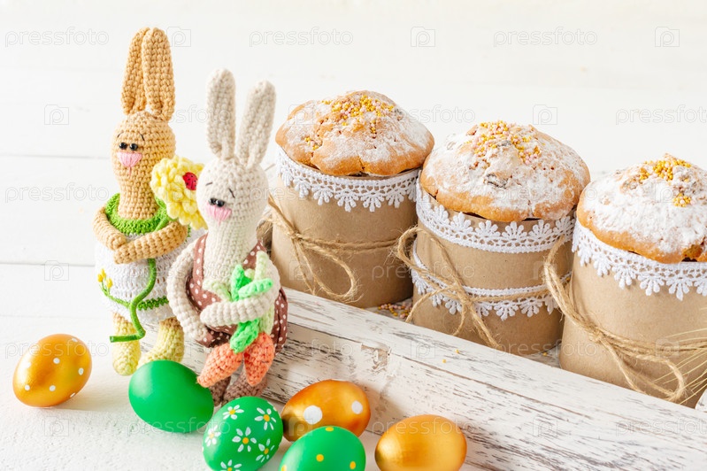 Украшение композиции Счастливой Пасхи праздник фон концепции. Куличи в деревянной коробке и весенние веточки. Пастельные цвета