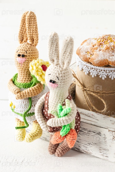 Украшение композиции Счастливой Пасхи праздник фон концепции. Куличи в деревянной коробке с вязаным кроликом ручной работы. Пастельные цвета