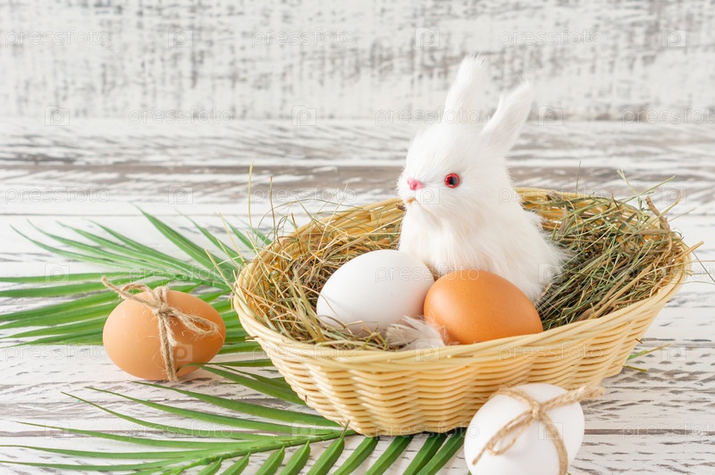 Праздничная пасхальная композиция с маленьким зайчиком, сидящим в корзинке с пасхальным яйцом. Деревенский стиль, экологичная и фермерская концепция