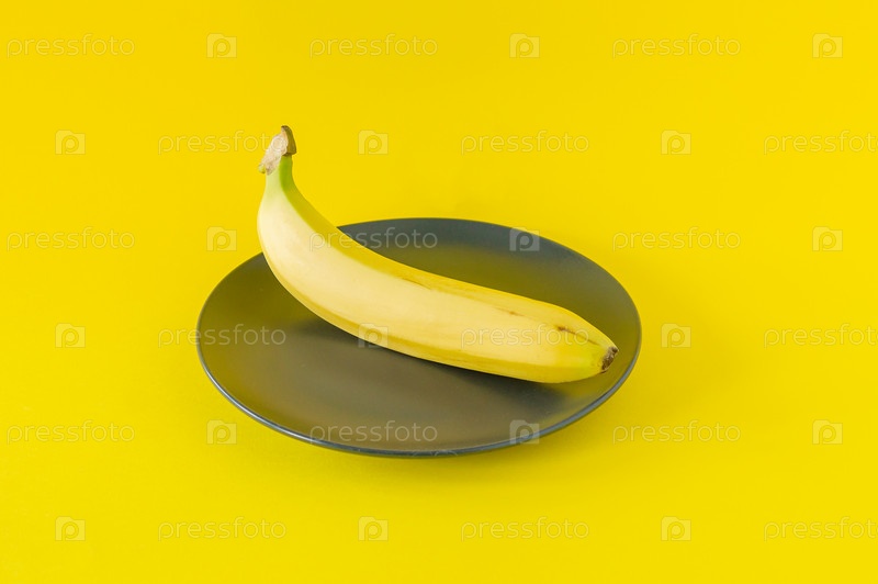 Спелый банан на черной тарелке на желтом фоне. Тропические фрукты для еды