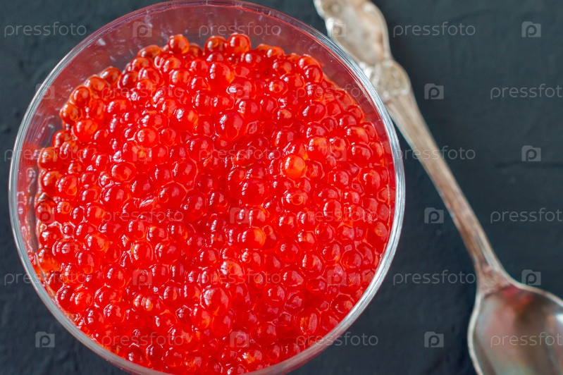 Красная икра в стеклянной банке с серебряной ложкой. Морепродукты. Здоровое питание. Диета. черный фон
