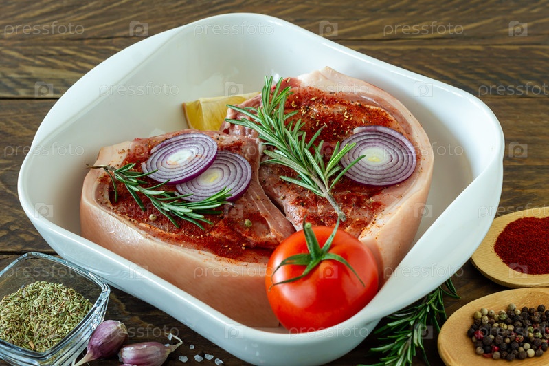 Кусочки сырого стейка из свинины со специями и травами, розмарином, солью и перцем в керамической форме для выпечки на деревянном фоне в деревенском стиле