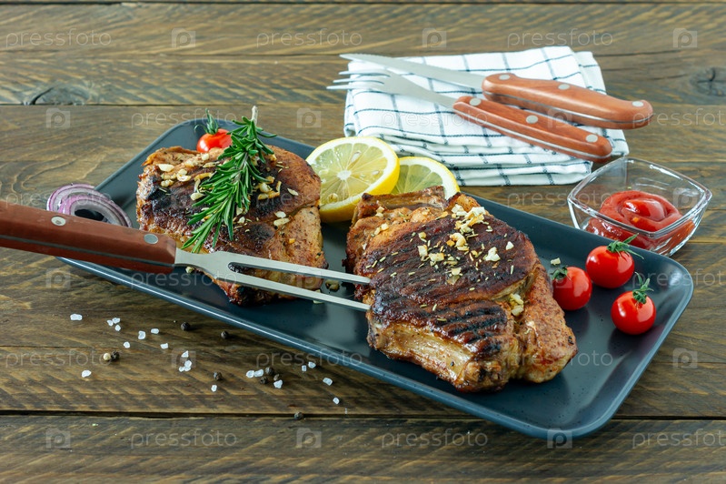 Свежее сочное жареное красное мясо на керамической тарелке на деревянной доске со специями и овощами. Ресторанная еда, вкусное блюдо