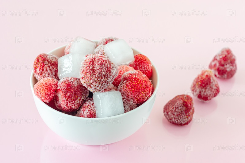 Замороженная клубника с кристаллами льда на розовом фоне
