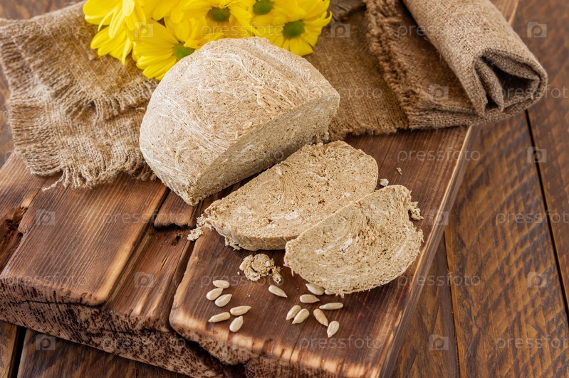 Вид сбоку на халву, восточный сладкий десерт из маслянистых семян арахиса, измельченных в пасту и смешанных с сахарным сиропом, который подается на деревянном столе с цветами