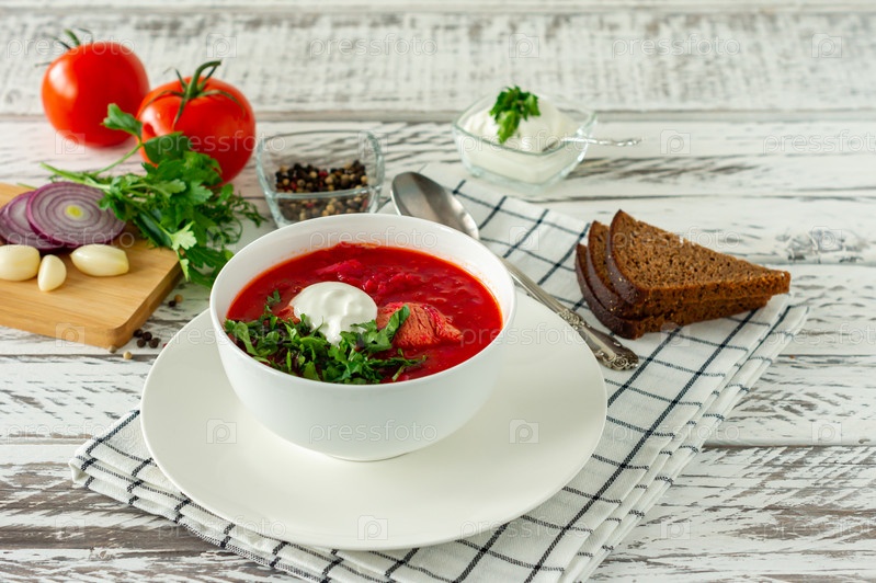 Традиционный украинский русский борщ с чесноком и хлебом. Чаша борща из красной свеклы на белом деревянном столе. Борщ. традиционная славянская кухня
