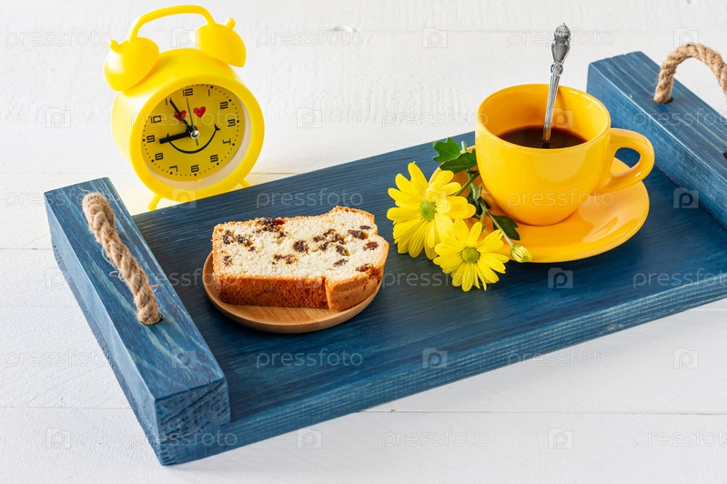 Кусочки пирога с изюмом и чашка кофе подаются на подносе. Утренний вкусный завтрак