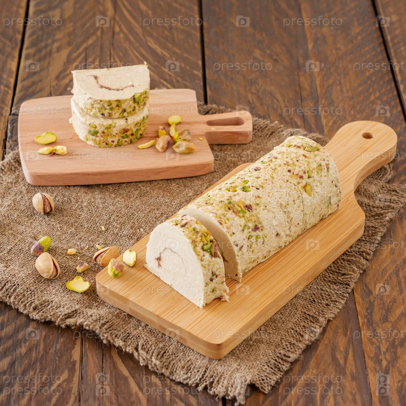 Халва с фисташками подается на разделочной доске. сладкий десерт из индейки