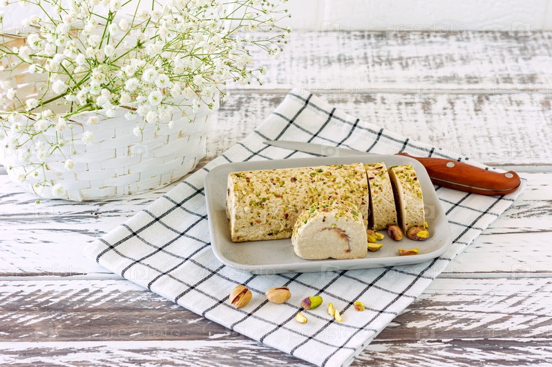 Нарезанная тахини халва с фисташками на белом деревянном столе, украшенном цветами