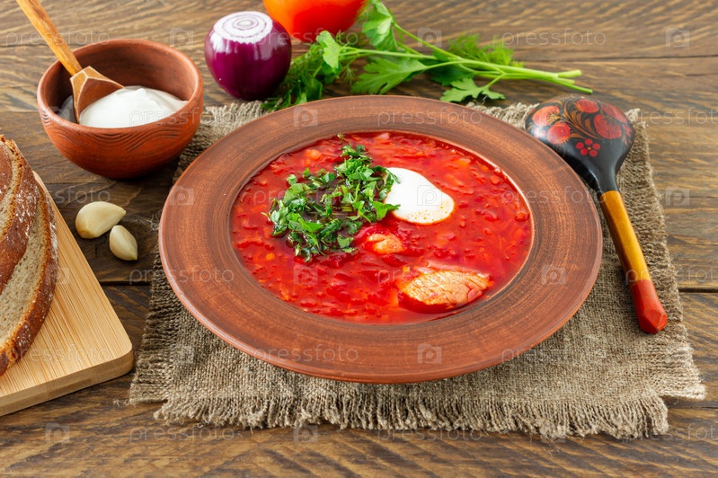 Борщ - традиционный украинский и русский свекольный суп на темном деревянном фоне. Подается с ржаным хлебом, чесноком и солью