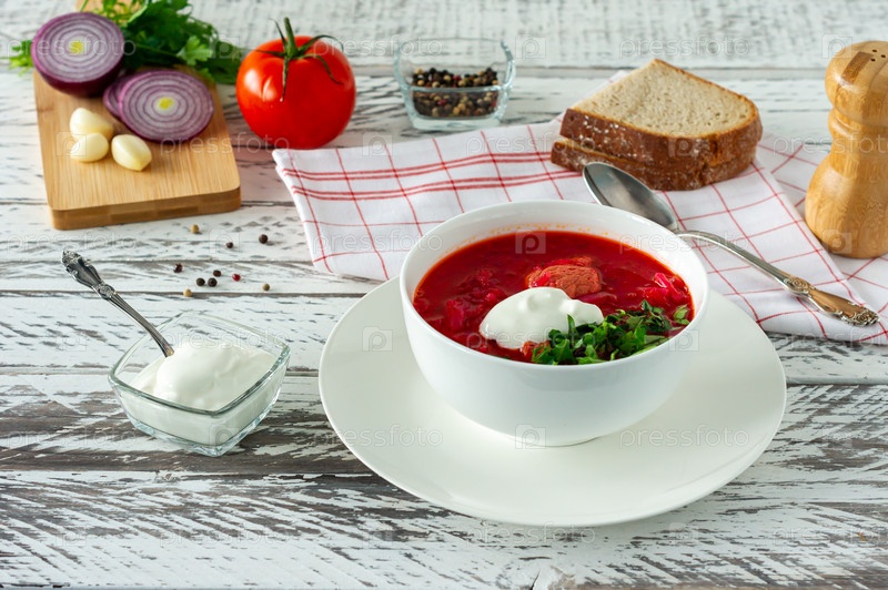 Традиционный украинский русский борщ с чесноком и хлебом. Чаша борща из красной свеклы на белом деревянном столе. Борщ. традиционная славянская кухня