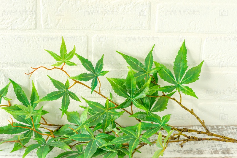 Крупный план многих зеленых листьев искусственной марихуаны, лекарственного растения с белой кирпичной стеной на заднем плане