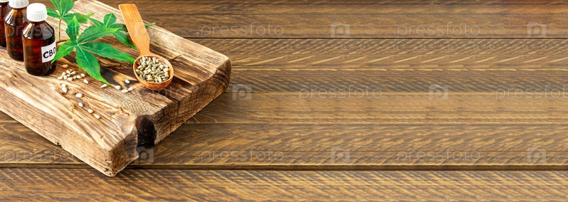 Семена конопли и экстракт конопляного масла CBD, фон зеленых листьев конопли, концепция медицинской каннабиса