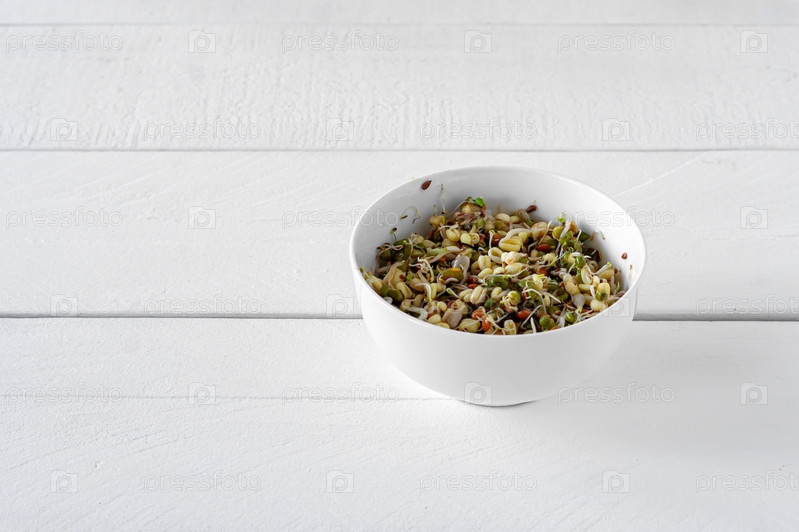 Проросшие бобы мунг в миске на белом столе. Здоровая концепция, макробиотическая пища